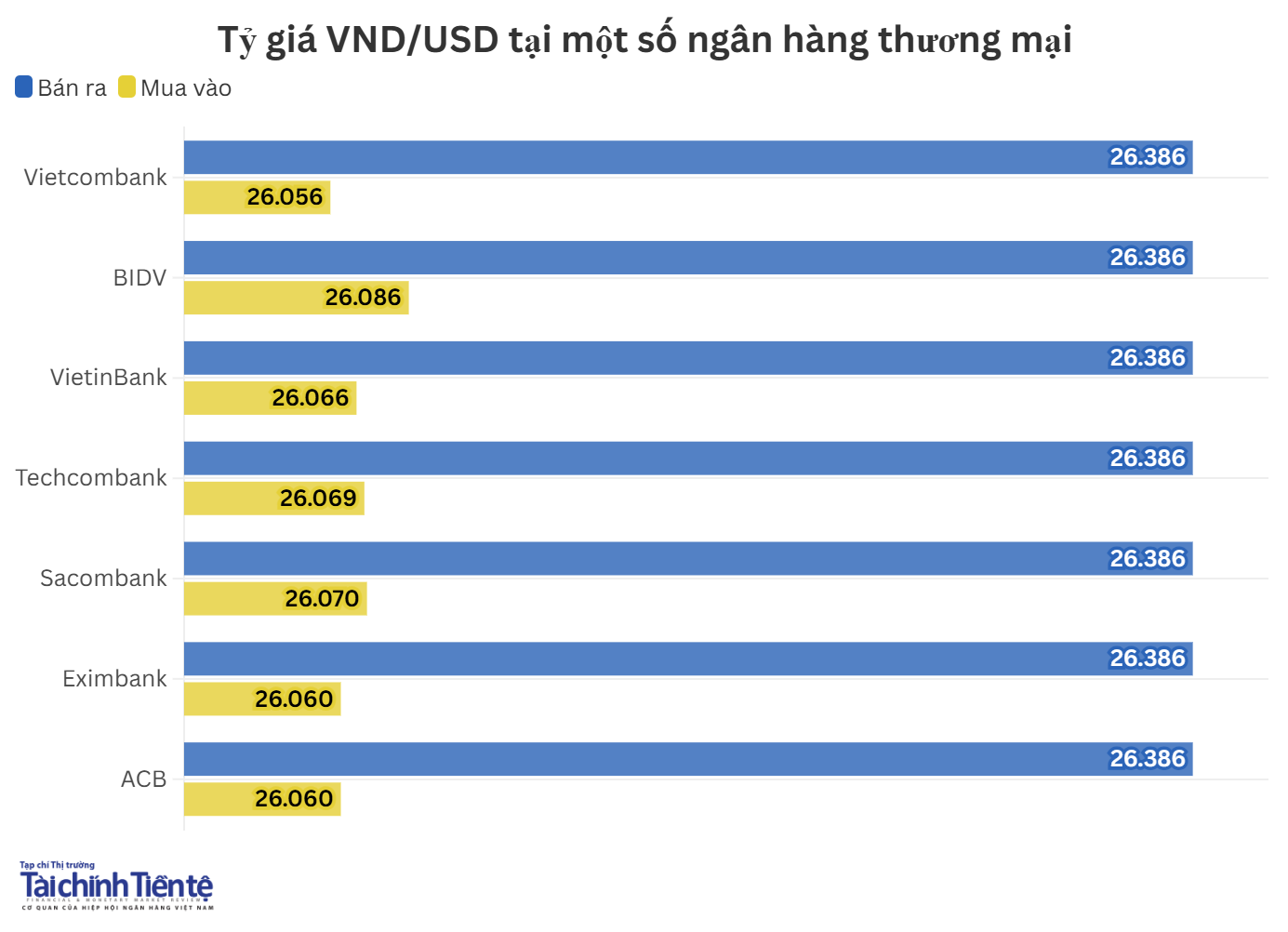Hiện, giá mua thấp nhất ở mức 26.056 VND/USD, giá mua cao nhất ở mức 26.086 VND/USD. Giá bán ra được các ngân hàng đồng loạt niêm yết ở mức 26.386 VND/USD.