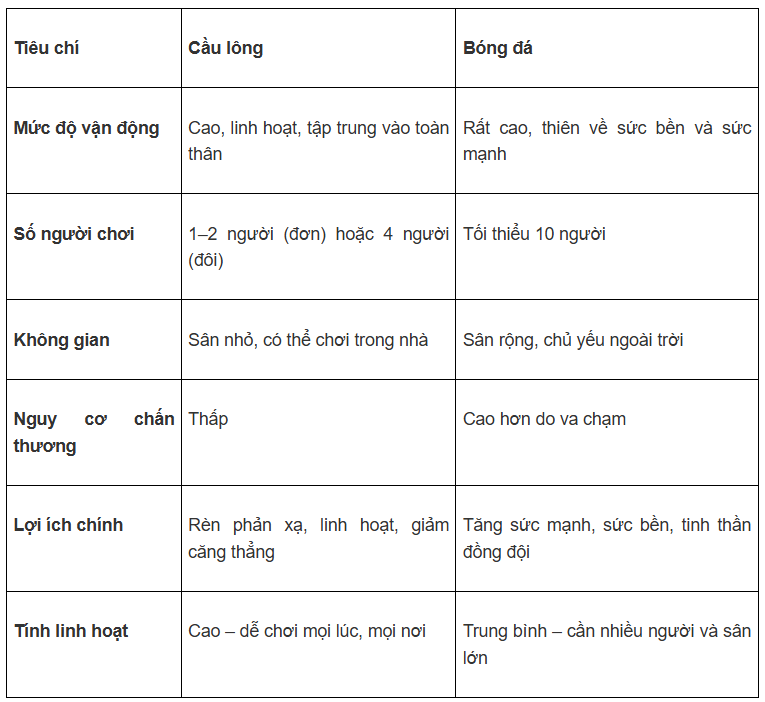 Từ bảng so sánh trên có thể thấy, cầu lông phù hợp với những ai muốn luyện tập đều đặn, kiểm soát tốt thời gian và tránh va chạm mạnh. Trong khi đó, bóng đá lại là lựa chọn tuyệt vời cho người yêu cảm giác thi đấu, tinh thần đồng đội và các hoạt động ngoài trời. Hãy cùng lựa chọn một cái tên đội bóng hay để bắt đầu tập luyện ngay thôi.
