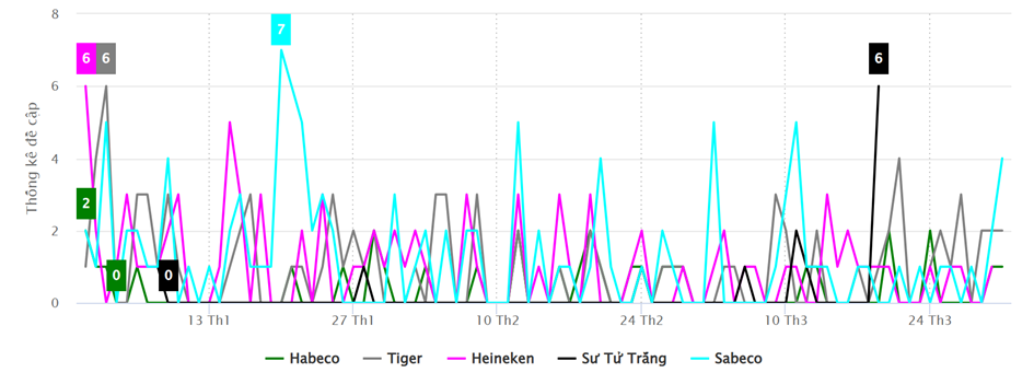 Sabeco, Tiger và Heineken là ba thương hiệu có lượt đề cập cao nhất trong quý I/2025. Từ dữ liệu cho thấy, Sabeco dẫn đầu với 36,9% tổng lượt đề cập, cao nhất trong tất cả các thương hiệu. Tiger xếp thứ hai với 28,3% lượt đề cập, theo sát là Heineken với 27%. Habeco và Sư Tử Trắng lần lượt đứng sau với tỷ lệ khiêm tốn là 6,6% và 1,1%.