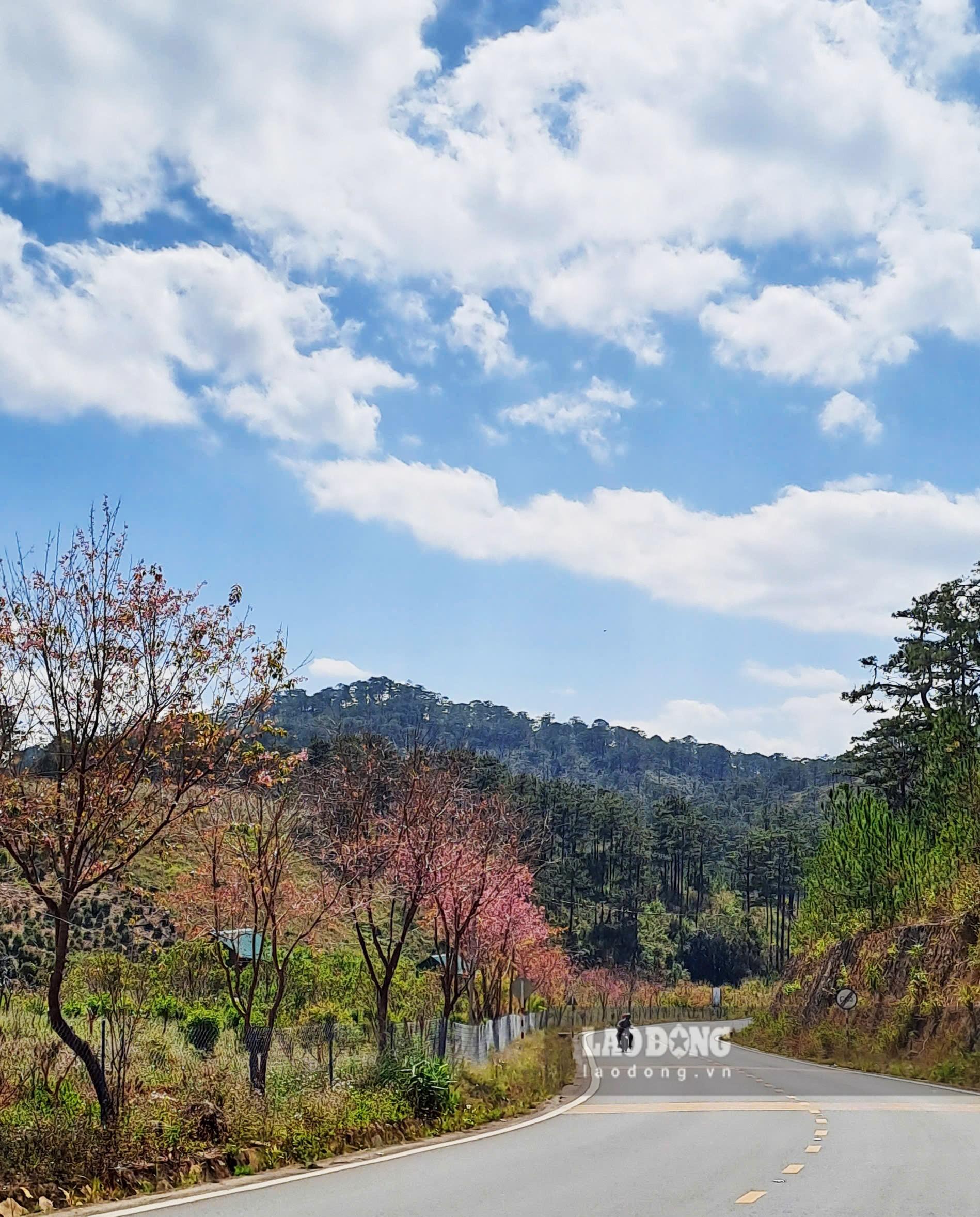 Chạy xe ra khỏi thành phố khoảng 50km, dọc đường bạn đã có thể nhìn thấy những cây mai anh đào bung nở rực rỡ, tô điểm cho mùa xuân sắp đến với vùng đất Tây Nguyên. Ảnh: Đan Thanh