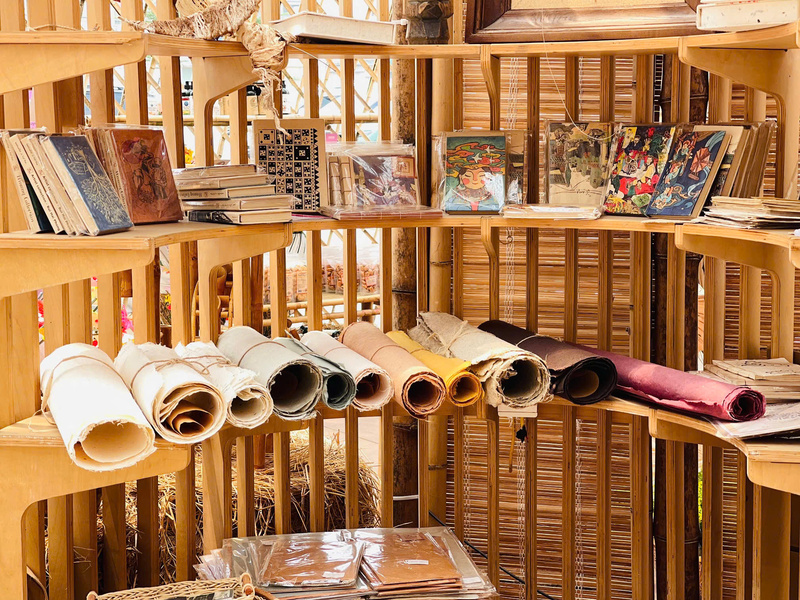 Khu trưng bày giấy dó mang đến trải nghiệm trực quan về quy trình làm giấy thủ công. Tại đây, người tham quan có thể tự tay thử nghiệm, khám phá kỹ thuật cầu kì của nghề làm giấy Việt Nam. Ảnh: Mai Linh