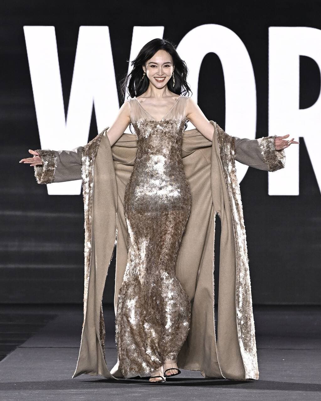 Đường Yên diện chiếc váy mạ vàng Haute Couture Xuân Hè 2023 của Fendi, bước lên sàn diễn thời trang của L'Oréal Paris với nụ cười rạng rỡ, thần thái tự tin. Nữ diễn viên tạo điểm nhấn khi nháy mắt trước ống kính.