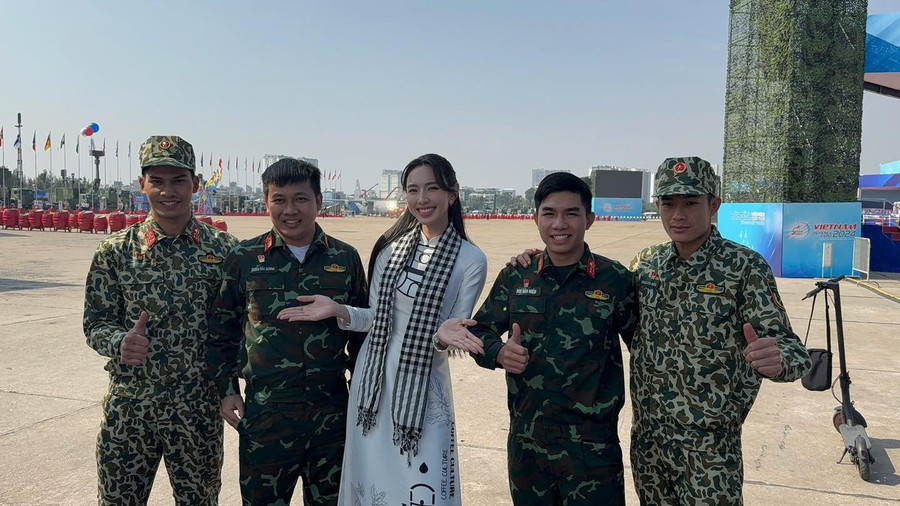 Cuộc hội ngộ bất ngờ của Hoa hậu Nguyễn Thúc Thùy Tiên cùng các chiến sĩ Sao nhập ngũ 2024 tại sự kiện Triển lãm Quốc phòng quốc tế Việt Nam 2024 vào ngày 19/12/2024.