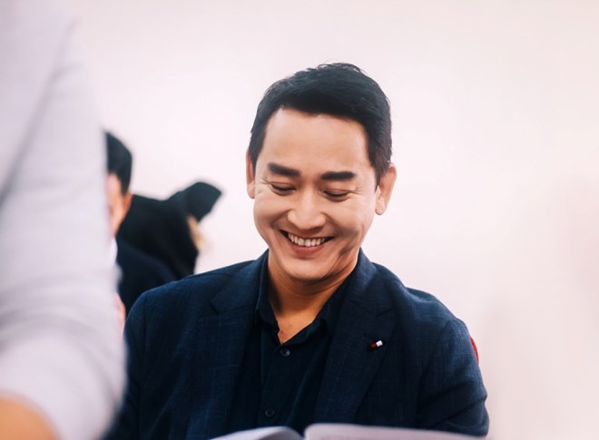 Hứa Vĩ Văn trong buổi trao đổi kịch bản cùng tổ đạo diễn. Ảnh: NVCC