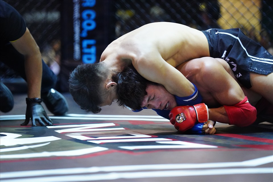 Võ sĩ Lê Văn Tuần (găng xanh) ra đòn siết cổ Nguyễn Trần Duy Nhất trong hiệp 1. Ảnh: H.A