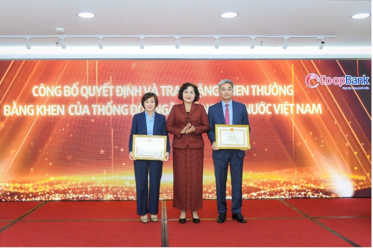Ủy viên BCH Trung ương Đảng, Thống đốc NHNN Việt Nam Nguyễn Thị Hồng trao Bằng khen cho Chủ tịch HĐQT Co-opBank Nguyễn Quốc Cường và Tổng Giám đốc Co-opBank Phạm Thị Hồng Minh