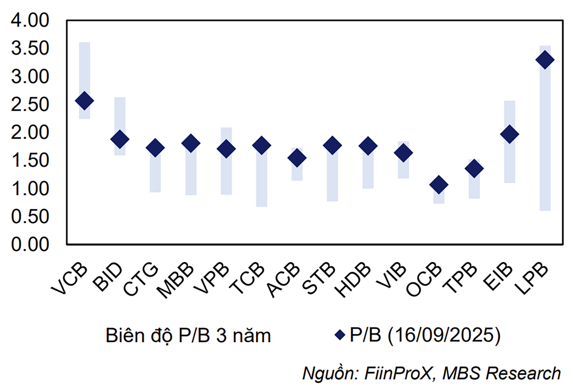 Hầu hết các ngân hàng đều đang giao dịch với mức P/B cao nhất 3 năm ngoại trừ VCB và BID