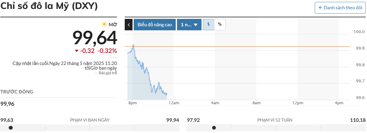 Cùng thời điểm, trên thị trường thế giới, chỉ số USD Index (DXY) - thước đo sức mạnh của đồng USD - đứng ở mức 99,64 điểm, giảm 0,32% so với phiên trước.