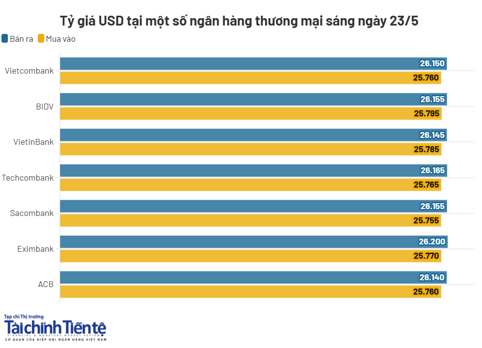Trong khi đó, giá mua - bán đồng bạc xanh tại hầu hết các ngân hàng được điều chỉnh theo xu hướng đi ngang so với chốt phiên ngày 22/5.