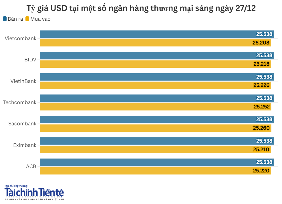 Giá mua - bán đồng bạc xanh tại các ngân hàng được điều chỉnh theo xu hướng tăng/giảm trái chiều, nhưng chủ yếu là tăng, với biên độ dao động từ 7 - 13 đồng so với chốt phiên ngày 26/12. Giá mua thấp nhất đang ở mức 25.208 VND/USD, giá mua cao nhất ở mức 25.260 VND/USD. Giá bán ra được hầu hết các ngân hàng niêm yết ở mức 25.538 VND/USD.