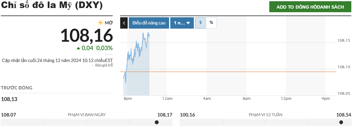 Cùng thời điểm, trên thị trường thế giới, chỉ số USD Index (DXY) - thước đo sức mạnh của đồng USD so với các đồng tiền chủ chốt khác - ở mức 108,16 điểm, tăng 0,03% so với phiên trước.