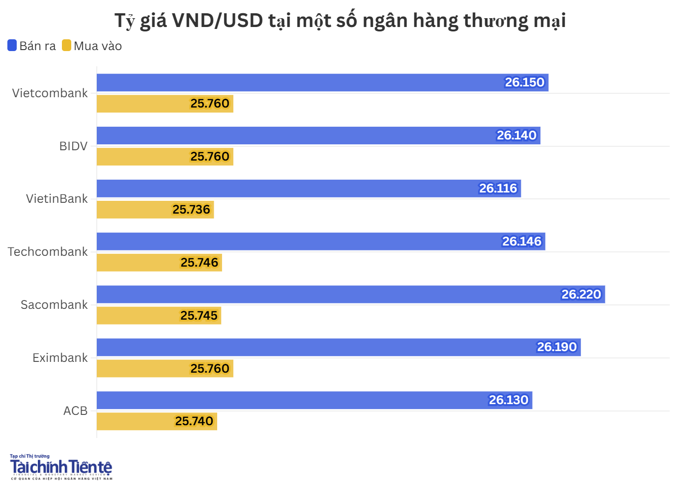 Hiện, giá mua thấp nhất ở mức 25.736 VND/USD, giá mua cao nhất ở mức 25.760 VND/USD. Giá bán ra thấp nhất ở mức 26.116 VND/USD, giá bán cao nhất ở mức 26.220 VND/USD.