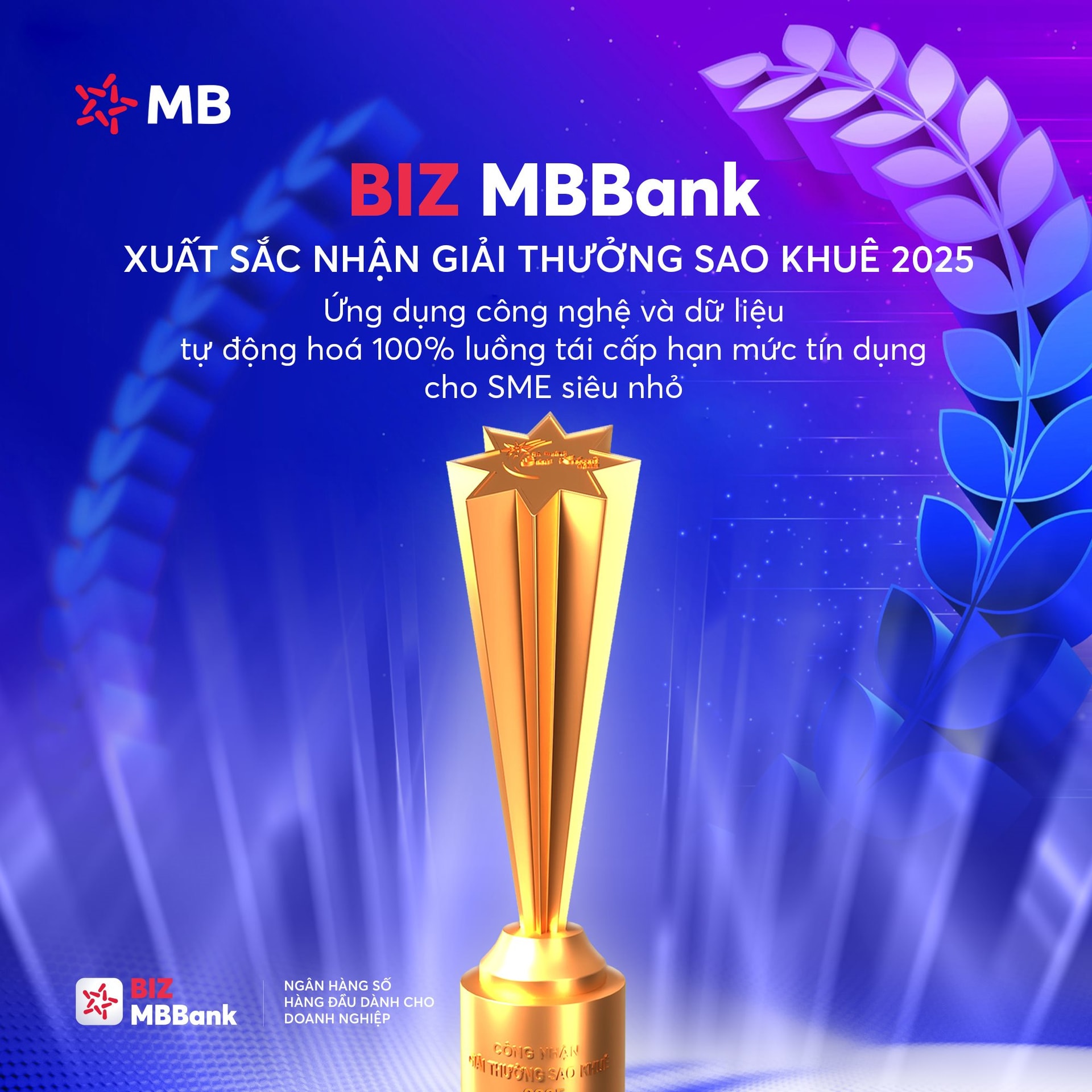 Ngân hàng số dành cho doanh nghiệp BIZ MBBank được vinh danh tại Giải thưởng Sao Khuê 2025 với 3 đề cử, trong đó Đề cử “Tự động hoá toàn trình Sản phẩm tín chấp SME siêu nhỏ” xuất sắc nhận đánh giá 5 sao nhờ thấu hiểu sâu sắc nhu cầu của khách hàng doanh nghiệp và ứng dụng công nghệ và dữ liệu để tạo nên sản phẩm đột phá.