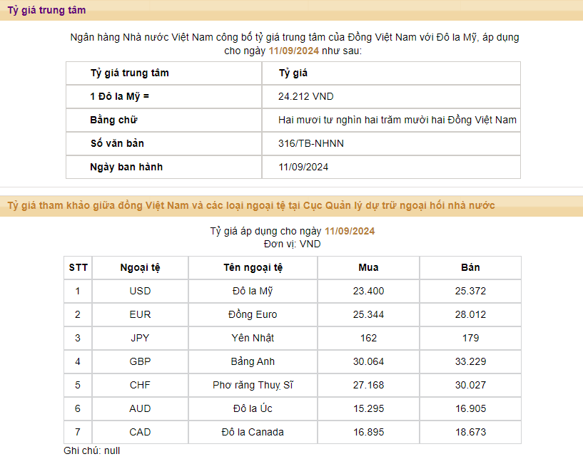 Sáng ngày 11/9, tỷ giá trung tâm giữa đồng Việt Nam (VND) với đô la Mỹ (USD) được Ngân hàng Nhà nước (NHNN) công bố ở mức 24.212 đồng, tăng 18 đồng so với chốt phiên ngày hôm qua (ngày 10/9). Đây là phiên tăng thứ 2 liên tiếp trong tuần.