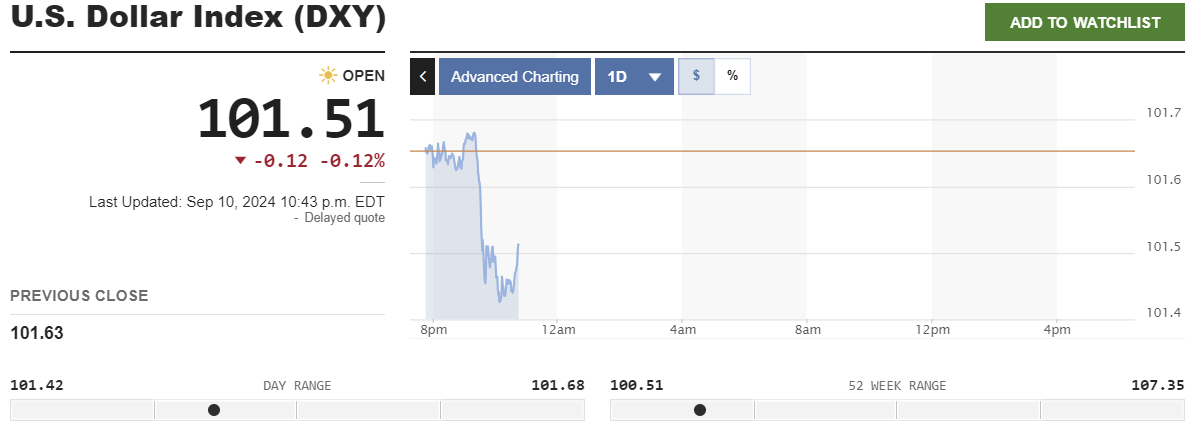 Chỉ số DXY giảm vào phiên giao dịch vừa qua, thu hẹp mức tăng gần đây khi các nhà đầu tư chờ đợi báo cáo lạm phát tiêu dùng tháng 8 để có thể xác định quy mô cắt giảm lãi suất dự kiến từ Ngân hàng Dự trữ Liên bang Mỹ (FED) vào tuần tới.