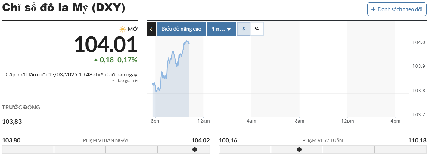 Cùng thời điểm, đồng USD tăng cao hơn khi căng thẳng thương mại leo thang. Hiện chỉ số USD Index (DXY) - thước đo sức mạnh của đồng USD - đứng ở mức 104,01 điểm, giảm 0,06% so với phiên trước.