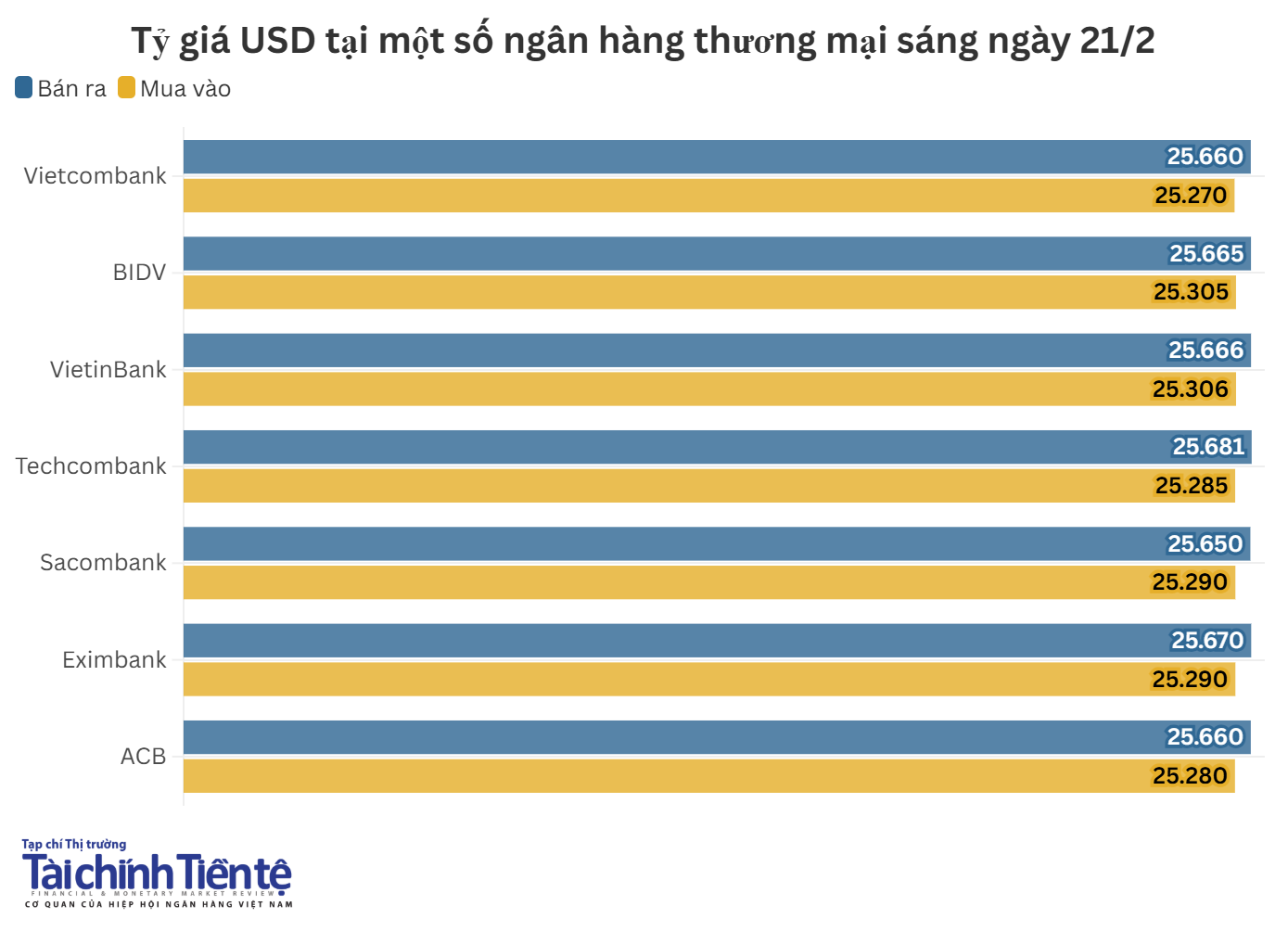 Cụ thể, lúc 9h30 phút hôm nay, tại Vietcombank, giá mua - bán đồng USD được niêm yết ở mức 25.270 - 25.660 VND/USD (mua vào - bán ra), giảm 50 đồng so với chốt phiên ngày 20/2.