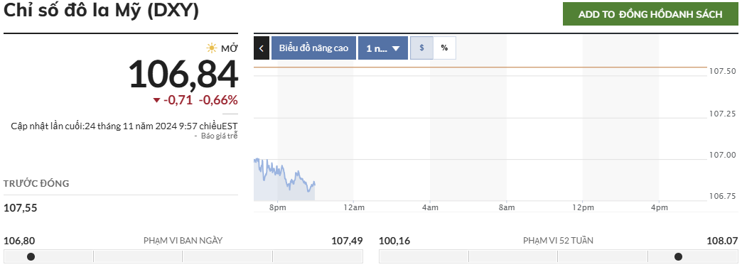 Chỉ số DXY giảm xuống dưới 107 vào phiên giao dịch vừa qua, thoái lui khỏi mức cao nhất trong 2 năm sau khi tân Tổng thống Mỹ Donald Trump đề cử Giám đốc Quỹ đầu cơ Scott Bessent làm Bộ trưởng Tài chính, mang lại cảm giác ổn định cho các nhà đầu tư.