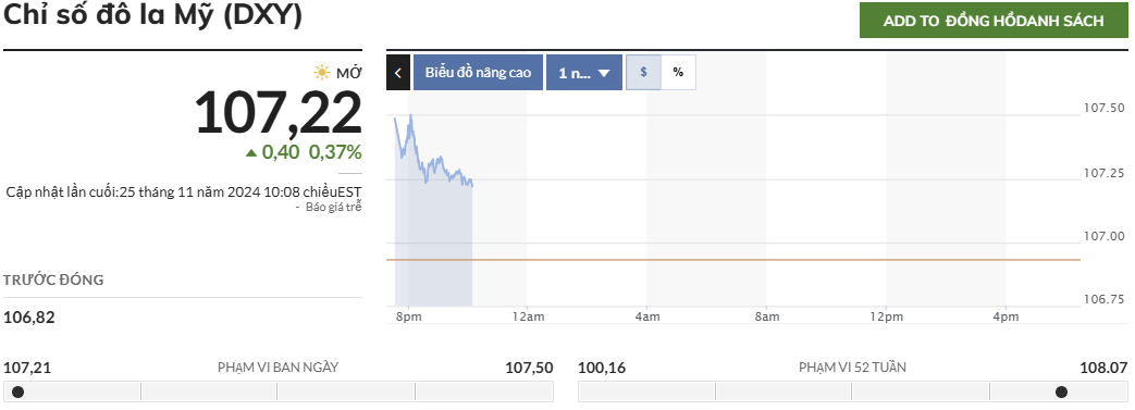 Cùng thời điểm, trên thị trường thế giới, chỉ số USD Index (DXY) - thước đo sức mạnh của đồng USD so với các đồng tiền chủ chốt khác ở mức 106,84 điểm, giảm 0,66% so với phiên trước.