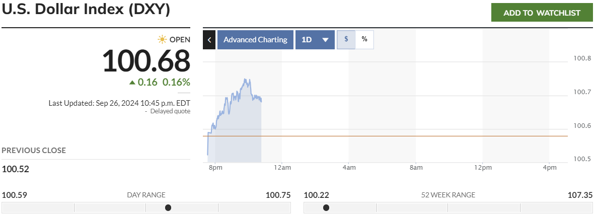 Hôm qua, chỉ số này chịu áp lực khi đồng Nhân dân tệ và các loại tiền tệ khác tăng giá sau khi Trung Quốc cam kết tăng cường các biện pháp hỗ trợ tài chính và tiền tệ. Trong khi đó, số đơn xin trợ cấp thất nghiệp hàng tuần tại Mỹ đã giảm xuống mức thấp nhất trong 4 tháng, cho thấy thị trường lao động nước này đang phục hồi.