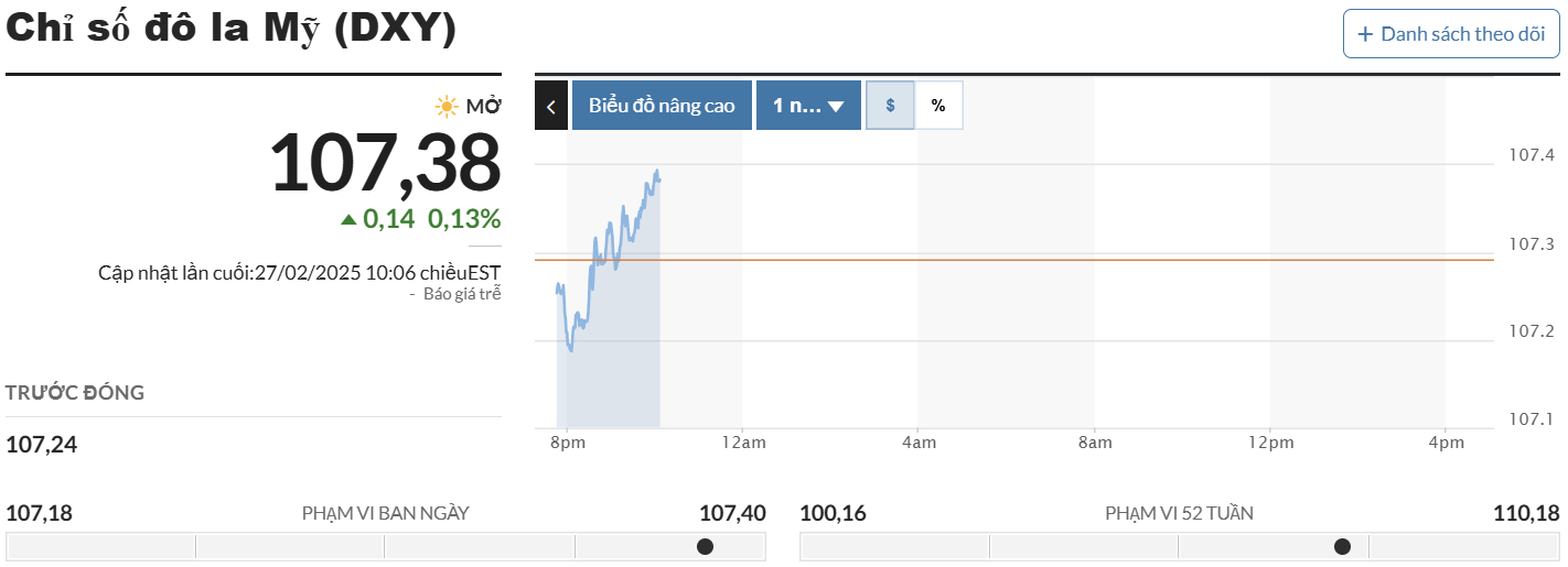 Cùng thời điểm, đồng USD giữ nguyên mức tăng khi thuế quan của Tổng thống Donald Trump sắp được áp dụng. Chỉ số USD Index (DXY) - thước đo sức mạnh của đồng USD - đứng ở mức 107,38 điểm, tăng 0,13% so với phiên trước.