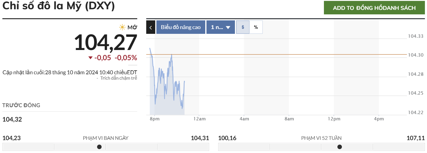 Cùng thời điểm, trên thị trường thế giới, chỉ số USD Index (DXY) - thước đo sức mạnh của đồng USD so với các đồng tiền chủ chốt khác ở mức 104,27 điểm, tăng 0,05% so với phiên trước.