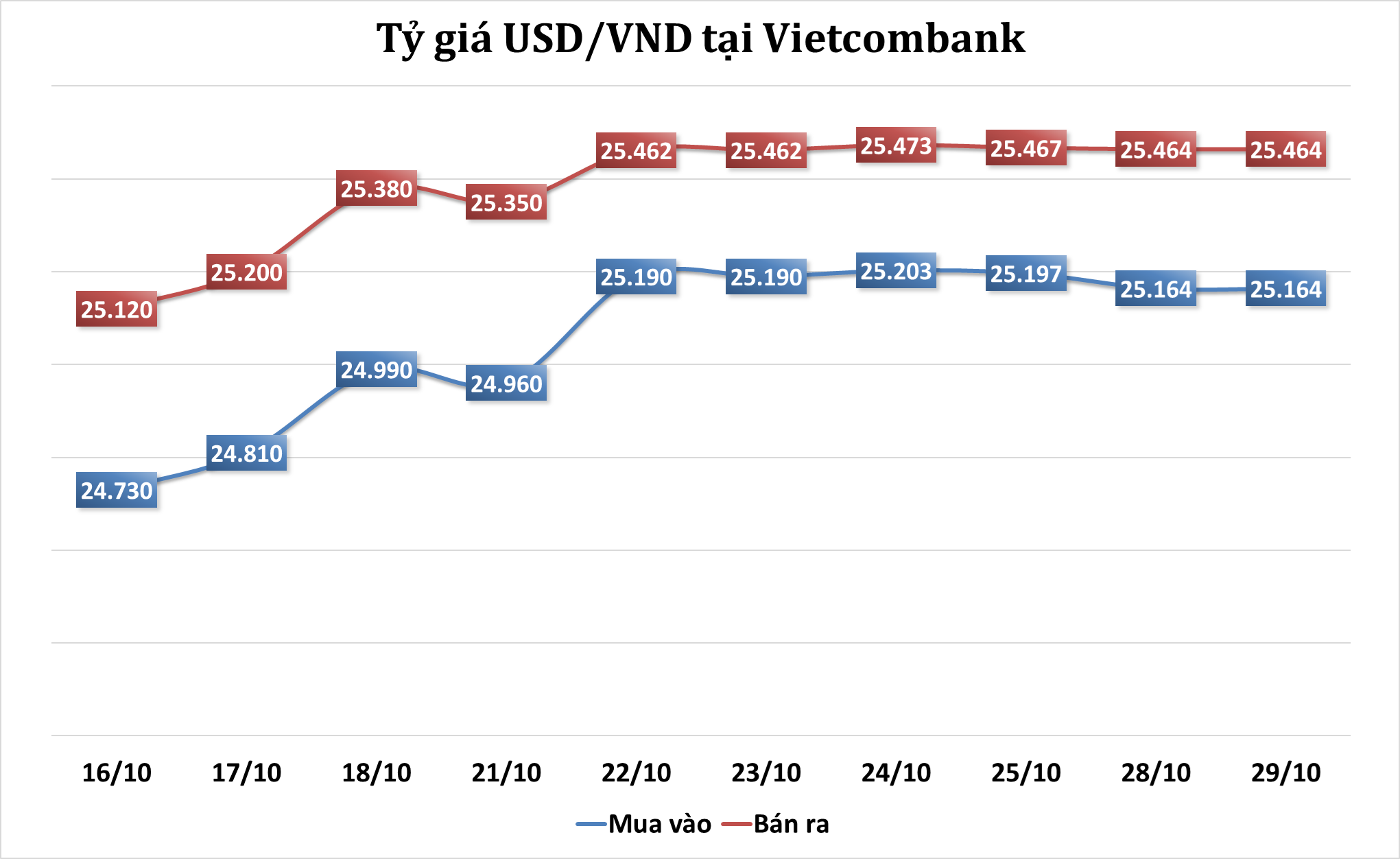 Giá mua - bán đồng bạc xanh tại nhiều ngân hàng cũng được điều chỉnh theo xu hướng đi ngang, không đổi so với chốt phiên hôm qua (ngày 28/10). Giá bán ra được hầu hết các ngân hàng niêm yết ở mức 25.464 VND/USD.
