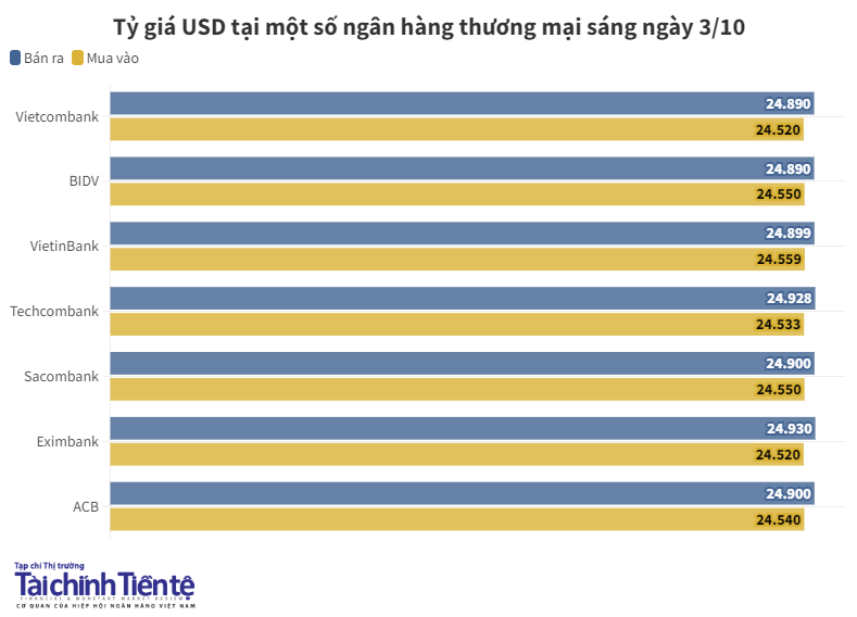 Trong khi đó, giá mua - bán đồng bạc xanh tại nhiều ngân hàng được điều chỉnh theo xu hướng tăng mạnh, với biên độ dao động từ 45 - 70 đồng so với chốt phiên hôm qua (ngày 2/10).