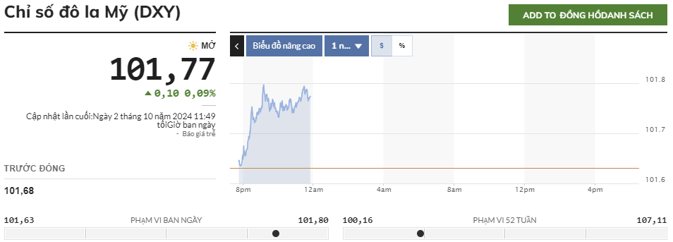 Cùng thời điểm, trên thị trường thế giới, chỉ số USD Index (DXY) - thước đo sức mạnh của đồng USD so với các đồng tiền chủ chốt khác ở mức 101,77 điểm, tăng 0,09% so với phiên trước.