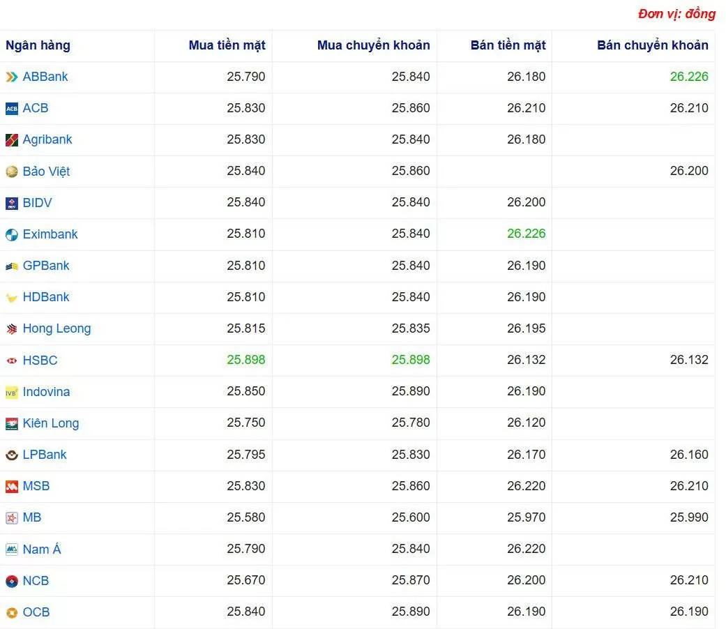 Ngân hàng ABBank đang bán chuyển khoản USD với giá cao nhất là: 1 USD = 26.226 VND