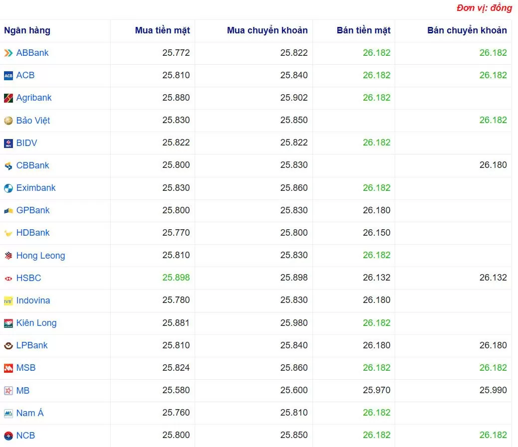 Cụ thể, tại ngân hàng Vietcombank, tỷ giá USD là 25.792 - 26.182 đồng/USD, tăng 42 đồng ở chiều mua và cả chiều bán ra, so với phiên giao dịch ngày hôm qua.