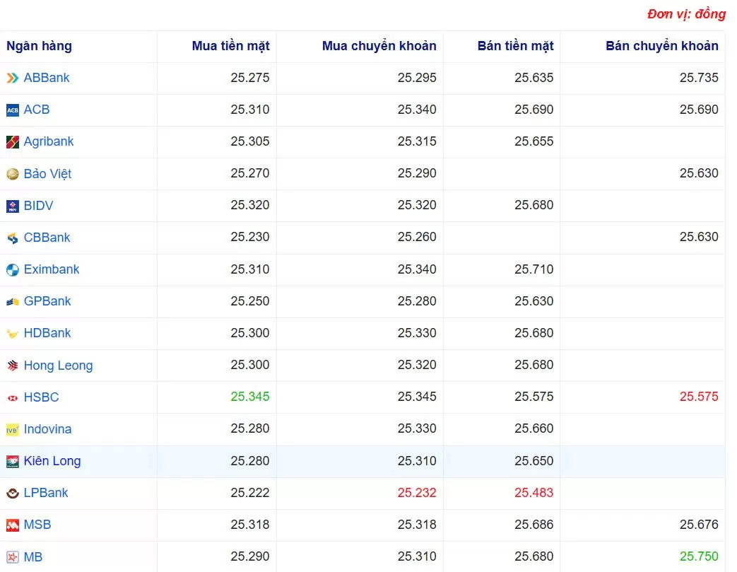 Ngân hàng HSBC đang bán chuyển khoản USD với giá thấp nhất là: 1 USD = 25.575 VND