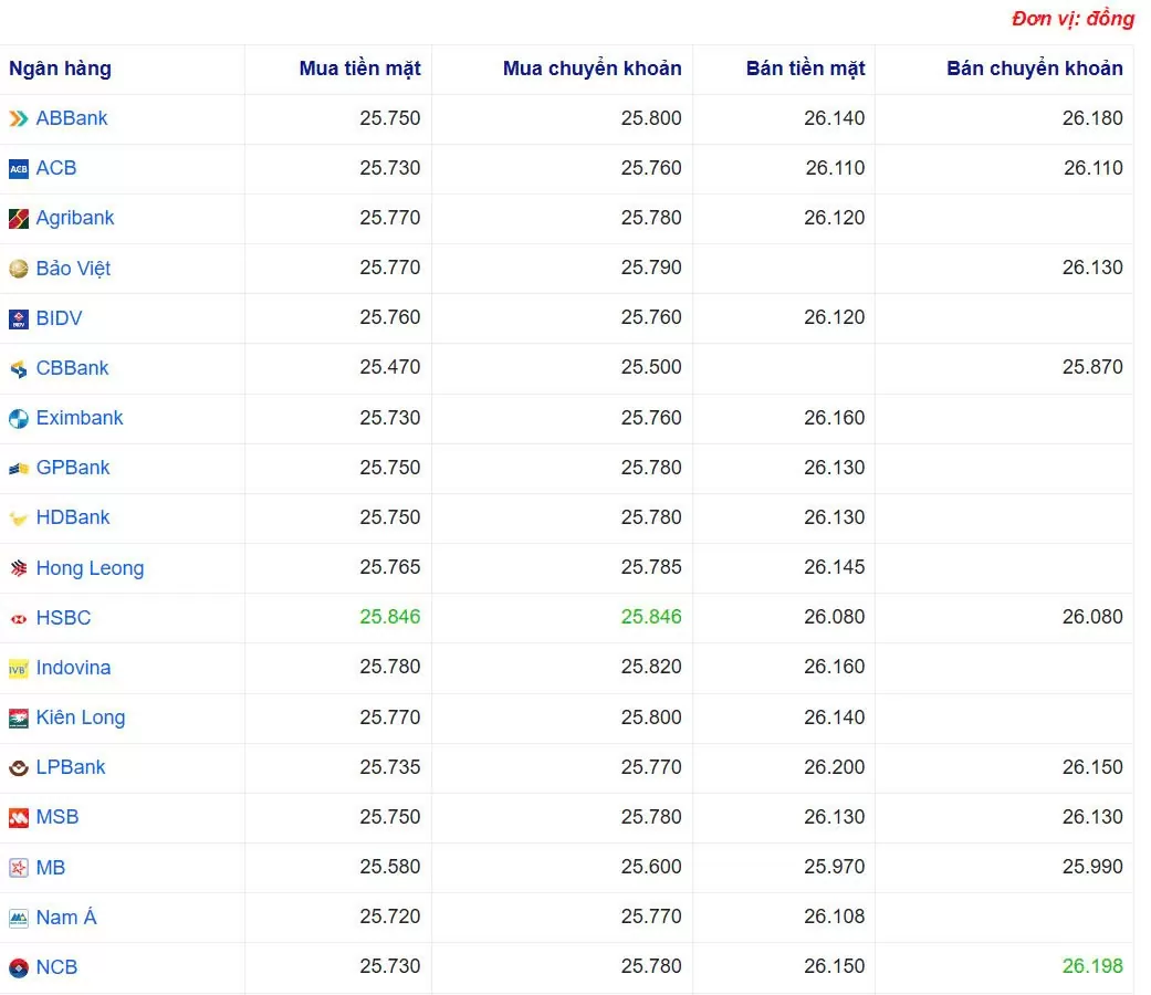Ngân hàng HSBC đang mua chuyển khoản USD với giá cao nhất là: 1 USD = 25.846 VND