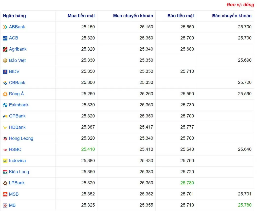 Ngân hàng MB đang bán chuyển khoản USD với giá cao nhất là: 1 USD = 25.780 VND