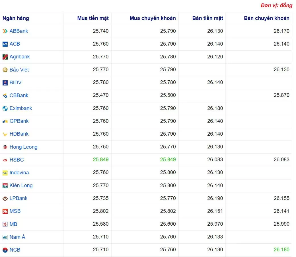 Ngân hàng HSBC đang mua chuyển khoản USD với giá cao nhất là: 1 USD = 25.849 VND