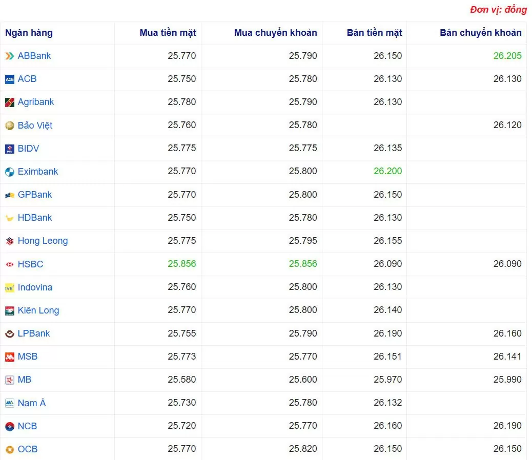Ngân hàng HSBC đang mua chuyển khoản USD với giá cao nhất là: 1 USD = 25.856 VND