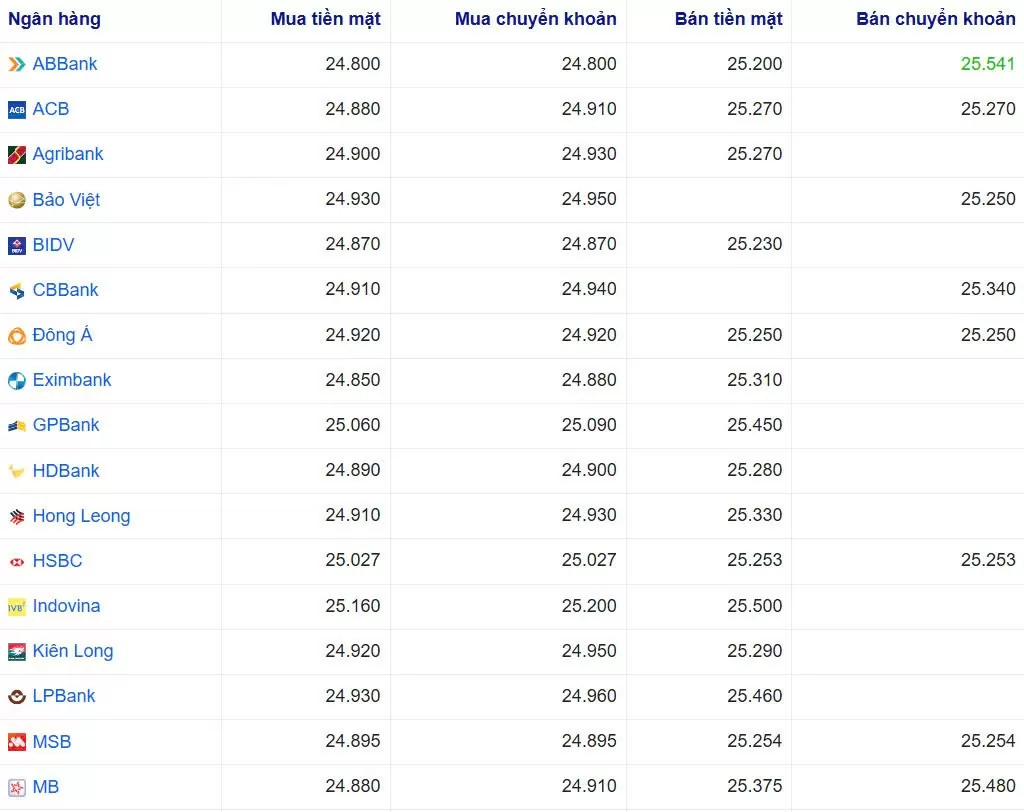 Ngân hàng ABBank đang bán chuyển khoản USD với giá cao nhất là: 1 USD = 25.541 VND