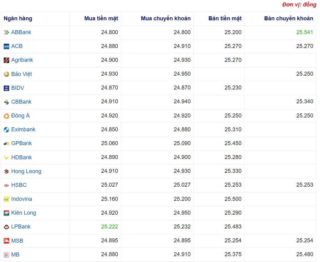 Ngân hàng ABBank đang bán chuyển khoản USD với giá cao nhất là: 1 USD = 25.541 VND