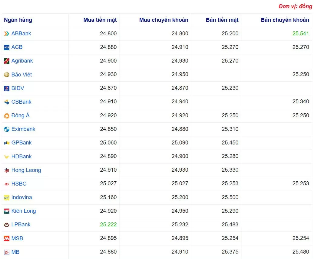 Ngân hàng LPBank, OceanBank đang mua tiền mặt USD với giá cao nhất là: 1 USD = 25.222 VND