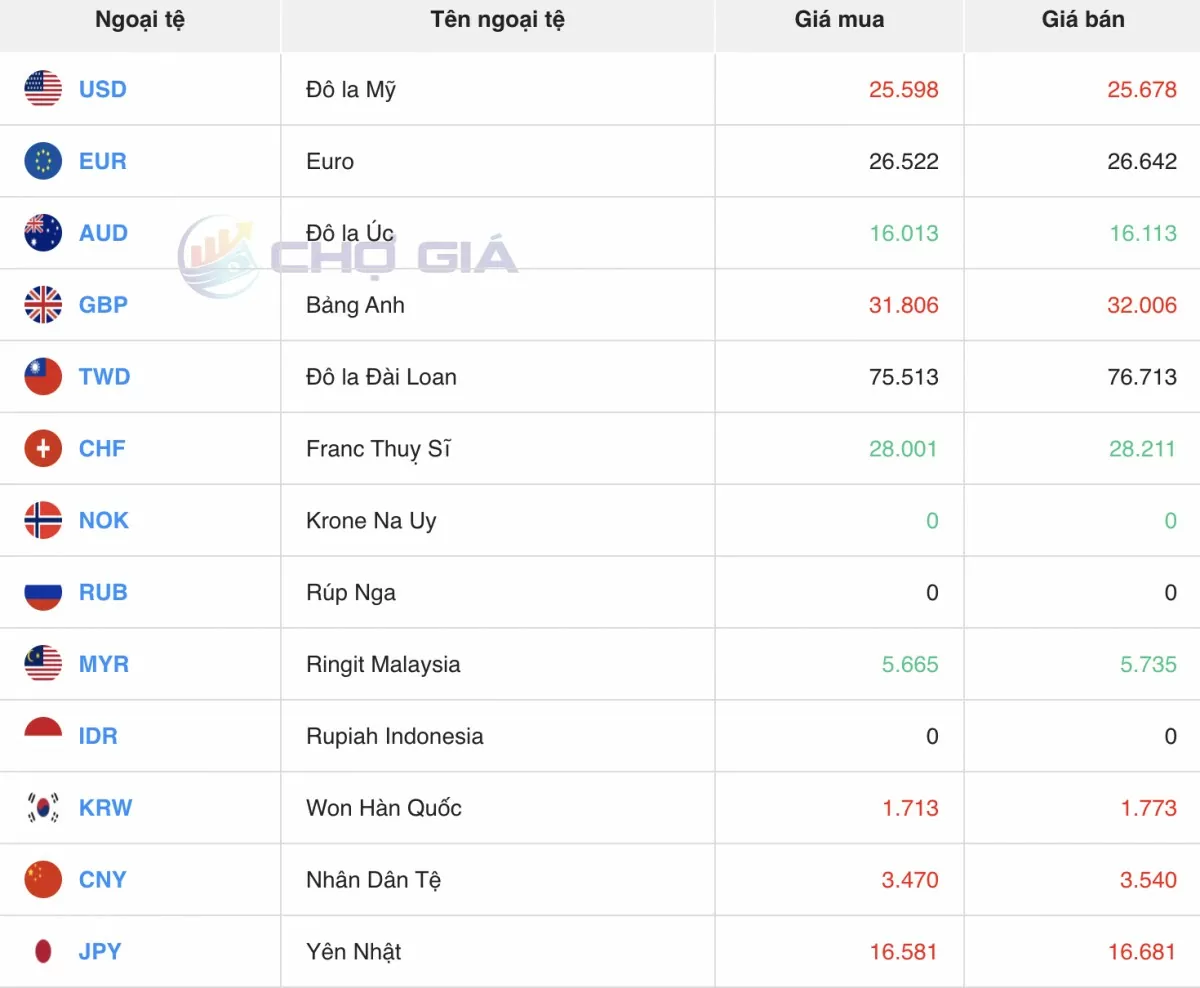 | Ngoại tệ | Mua | Bán | ||