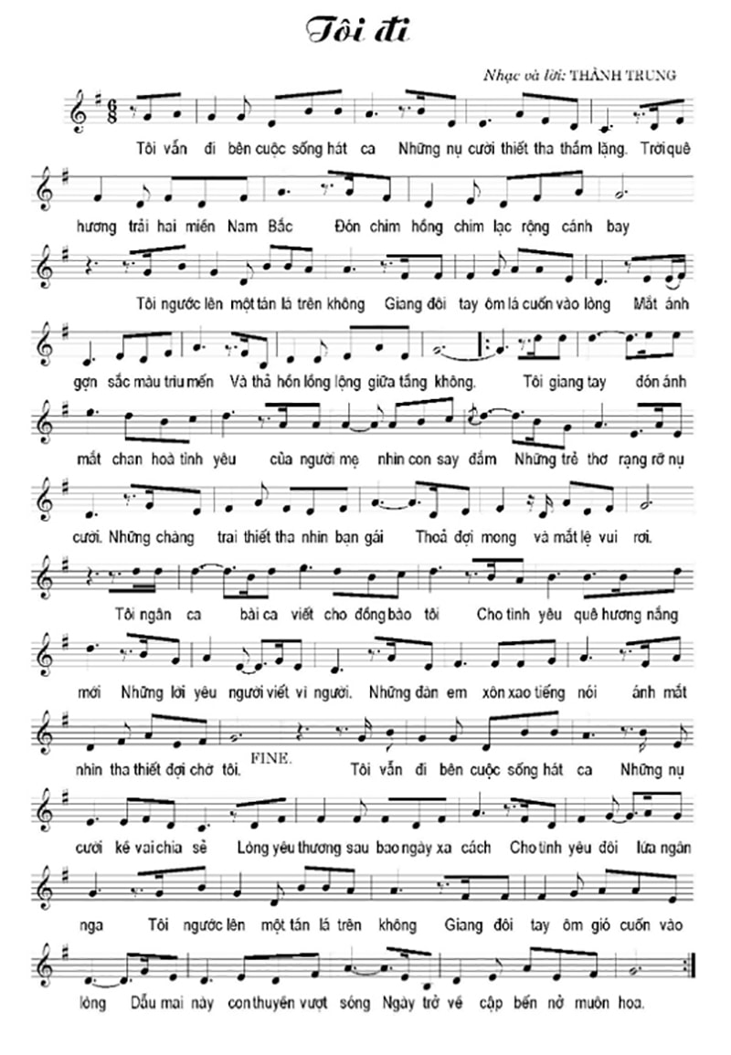 Nhịp 6/8 và cảm thức lữ hành: Tác phẩm viết ở nhịp 6/8 là một lựa chọn giàu ý nghĩa. Nhịp 6/8 thường gắn với chuyển động đung đưa, cảm giác ru nhẹ hoặc bước chân lãng du. Trong “Tôi đi”, 6/8 không mang tính dân ca rõ rệt mà thiên về ballad tự sự. Sự phân nhóm 3+3 tạo dòng chảy mềm mại, phù hợp với chủ đề “đi nhưng không vội”.