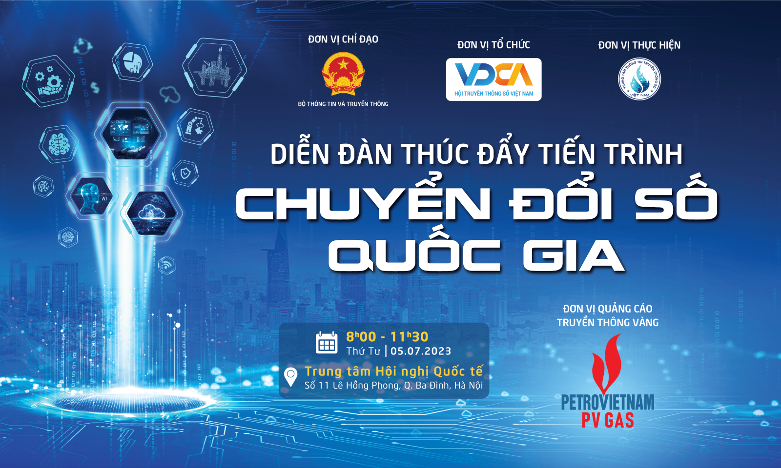 Sắp tới, ngày 5/7/2023 lúc 8h00 tại Trung tâm Hội nghị Quốc tế, số 11 Lê Hồng Phong, Ba Đình, Hà Nội sẽ diễn ra “Diễn đàn Thúc đẩy Tiến trình Chuyển đổi số Quốc gia” do Hội Truyền thông số Việt Nam phối hợp với các đơn vị liên quan tổ chức. Chương trình nằm trong chuỗi hoạt động: Khảo sát, đánh giá, kiến tạo giải pháp và tôn vinh các đơn vị điển hình trong thúc đẩy tiến trình chuyển đổi số hướng đến kỷ niệm ngày chuyển đổi số Quốc gia 10/10/2023.