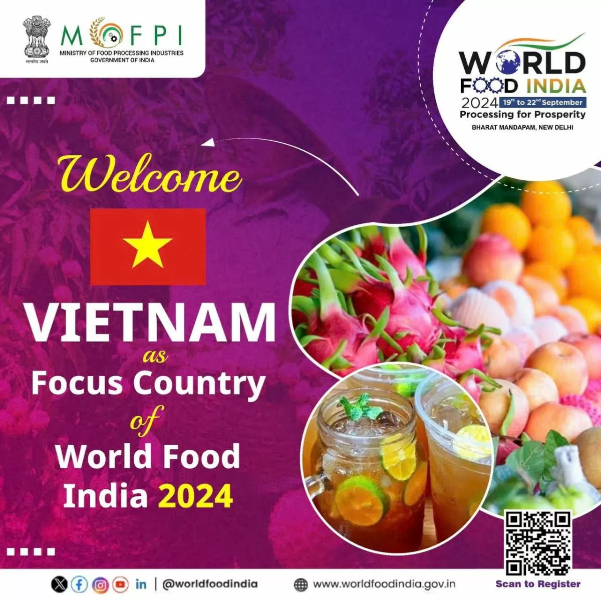 Ngày 19/9/2024, Hội chợ triển lãm WFI 2024 khai mạc tại Trung tâm triển lãm Pragati Maidan, thủ đô New Delhi với sự tham dự của hơn 90 nước, 26 bang và lãnh thổ liên bang Ấn Độ và lãnh đạo của 18 bộ, ban ngành Ấn Độ. Đây là lần thứ 3 Hội chợ WFI được tổ chức, do Bộ Công nghiệp Chế biến thực phẩm Ấn Độ phối hợp với Liên đoàn các Phòng Thương mại và Công nghiệp Ấn Độ (FICCI) chủ trì, diễn ra trong 4 ngày (từ ngày 19 - 22/9/2024).