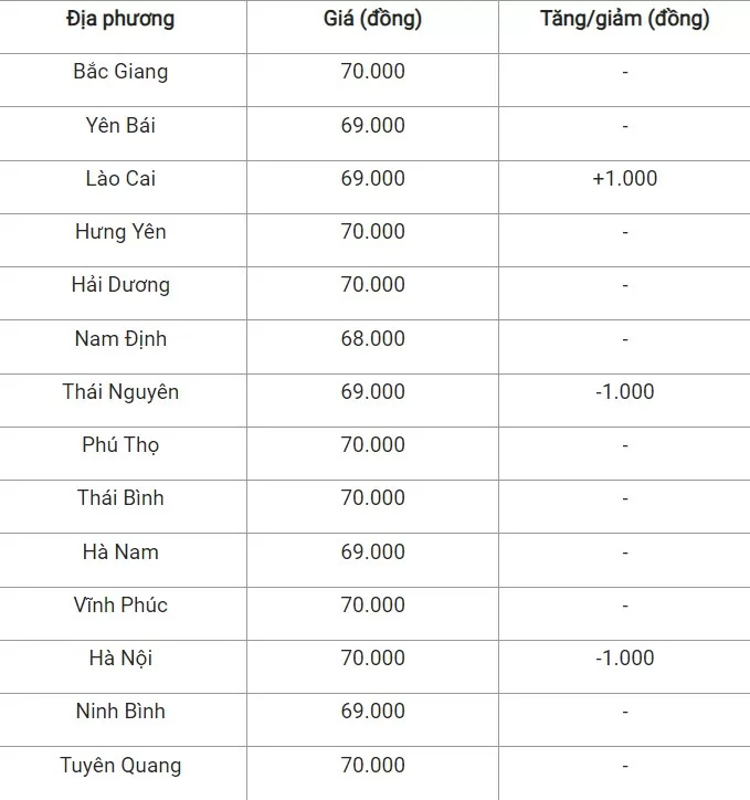 Sau tăng một giá, thương lái tại Yên Bái, Ninh Bình đang thu mua heo hơi với giá 69.000 đồng/kg ngang bằng với tại Hà Nam. Thương lái Bắc Giang, Hưng Yên, Hải Dương, Thái Nguyên, Tuyên Quang, Phú Thọ, Thái Bình, Vĩnh Phúc đang thu mua heo hơi với giá 70.000 đồng/kg.
