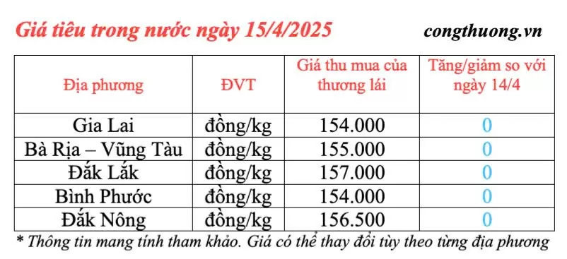 Giá tiêu hôm nay được cập nhật lúc 4h30 sáng ngày 15/4/2025 như sau, thị trường tiêu trong nước ổn định, đi ngang và neo ở mức cao so với hôm qua. Hiện giá tiêu thu mua trung bình tại các địa bàn trọng điểm là 155.300 đồng/kg.