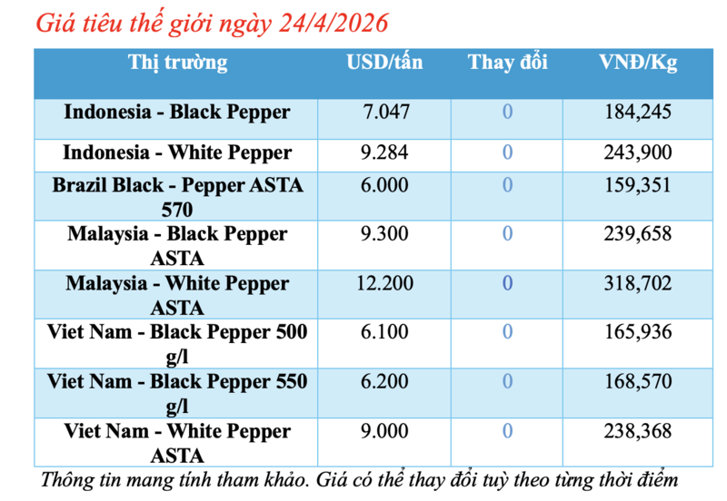 Cập nhật dữ liệu từ Hiệp hội Hồ tiêu Quốc tế (IPC) sáng 24/4/2026, hồ tiêu xuất khẩu hôm nay không ghi nhận phiên điều chỉnh mới. Các thị trường xuất khẩu hồ tiêu lớn đều duy trì mức giá ổn định.