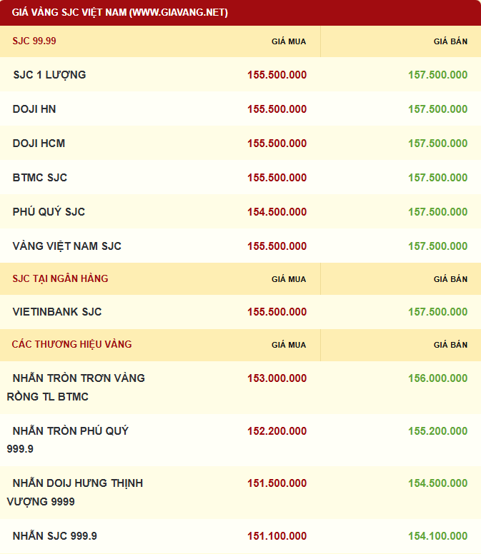 Giá vàng miếng được Công ty TNHH MTV Vàng bạc đá quý Sài Gòn - SJC, Bảo Tín Minh Châu, PNJ, Tập đoàn DOJI cùng niêm yết giá vàng ở mức 155,5-157,5 triệu đồng/lượng, tăng 900.000 đồng/lượng ở cả chiều mua vào và chiều bán ra so chốt phiên hôm trước. Chênh lệch mua-bán ở mức 2 triệu đồng. Đà tăng này cũng chính thức kéo giá vàng miếng SJC trong nước lần đầu đạt 157,5 triệu đồng/lượng, thiết lập đỉnh lịch sử mới.