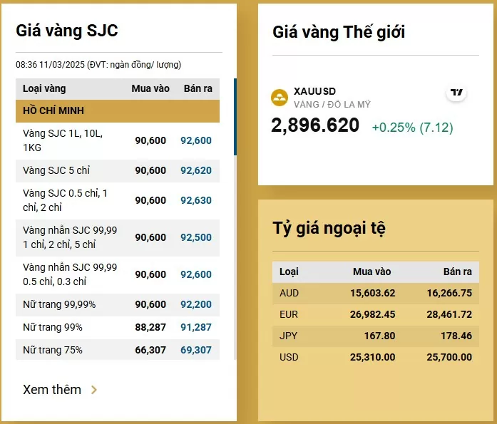 Giá vàng trong nước giảm theo đà giảm của giá vàng thế giới. Giá vàng thế giới sụt giảm mạnh xuống còn 2.896 USD/ounce. Giá vàng giảm khi thị trường chứng khoán Mỹ chịu áp lực bán mạnh dẫn đến các nhà đầu tư vàng đã thực hiện chốt lời ngắn hạn.