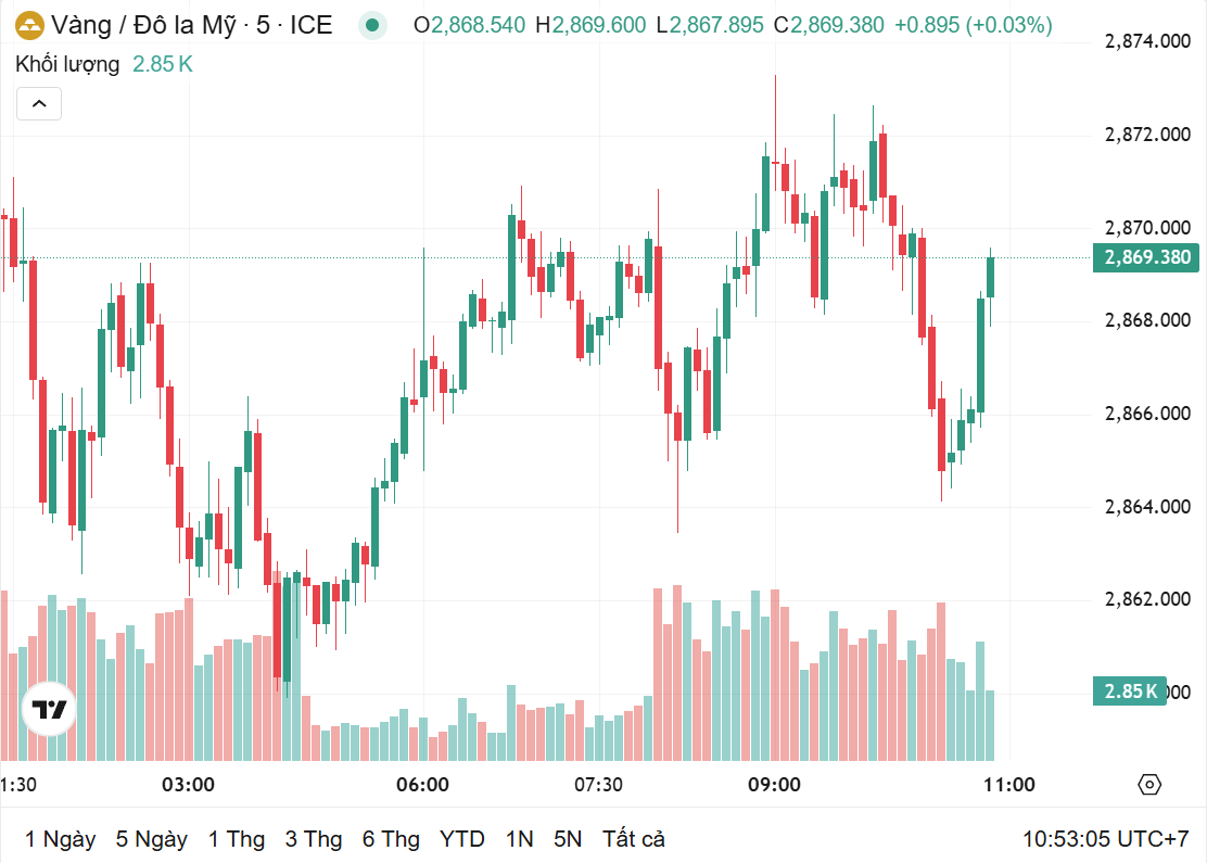 Trên thị trường quốc tế, vào lúc 11h05 (ngày 6/2, giờ Việt Nam), giá vàng giao dịch tăng 25,42 USD, đứng ở mức 2.869 USD/ounce, tương đương 87,66 triệu đồng/lượng (đã bao gồm thuế, phí), chênh lệch với vàng miếng SJC khoảng 3,3 triệu đồng.