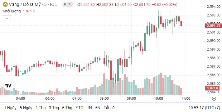 Cùng thời điểm, giá vàng thế giới tăng 33,17 USD, hiện đứng ở mức 2.591,79 USD/ounce – cách đỉnh kỷ lục 2.600 USD/ounce chưa tới 10 USD. Quy đổi theo tỷ giá ngân hàng (chưa kể thuế, phí), giá vàng thế giới tương đương 77,32 triệu đồng/lượng, thấp hơn giá vàng miếng SJC bán ra khoảng 4,68 triệu đồng/lượng.